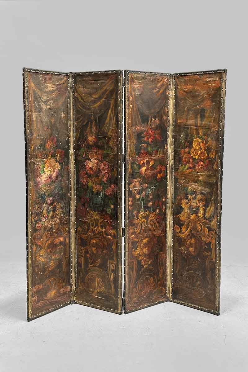 Four Leaf Painted Leather Screen with Faces Flowers & Swags (worn)