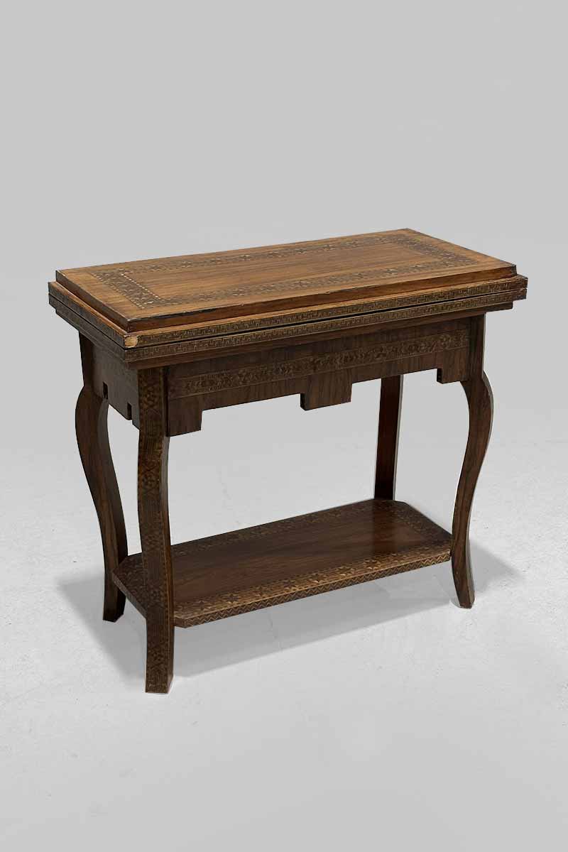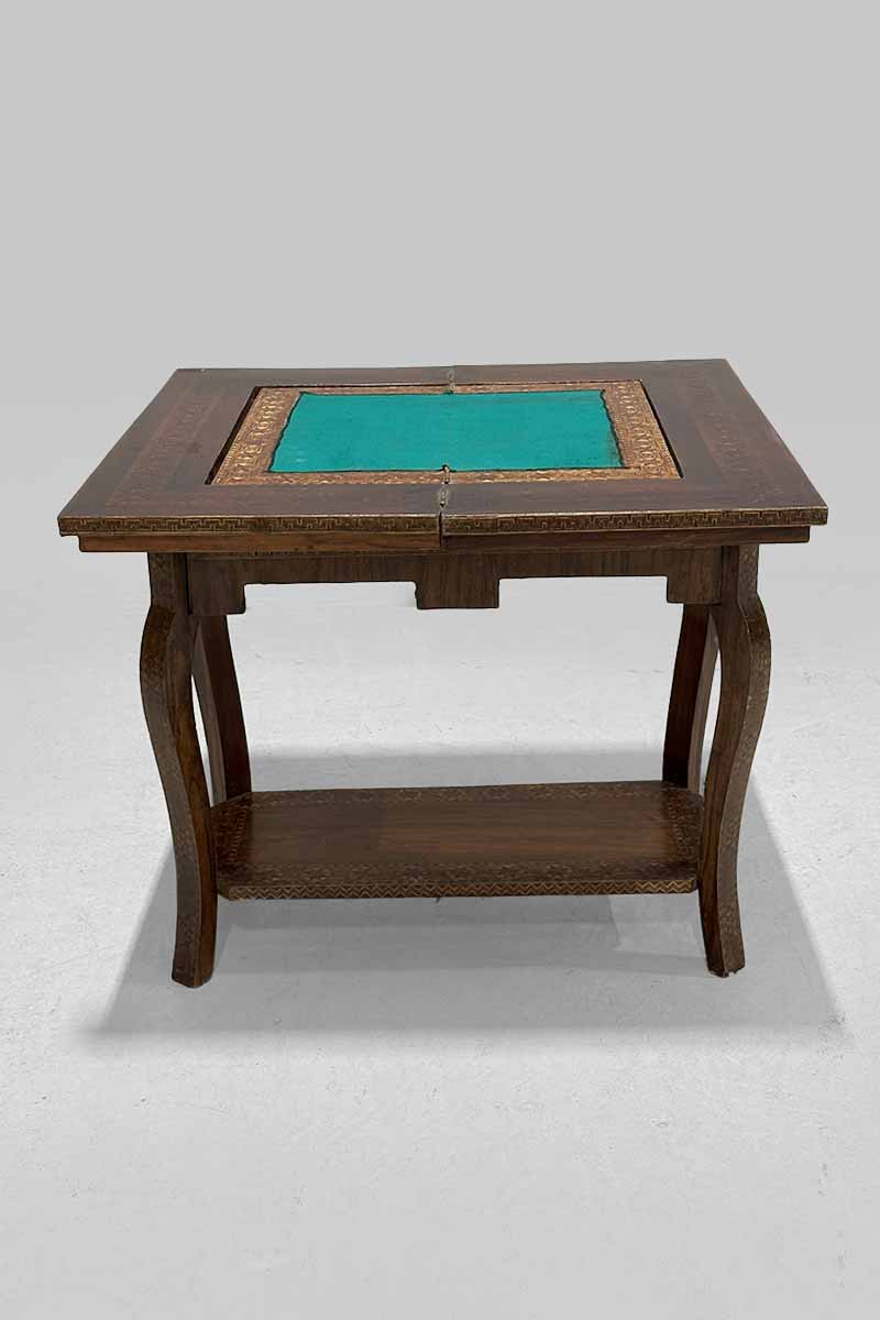 Arabic Inlaid 2 Tier Fold Over Card Table with Smaller Green Baize Interior