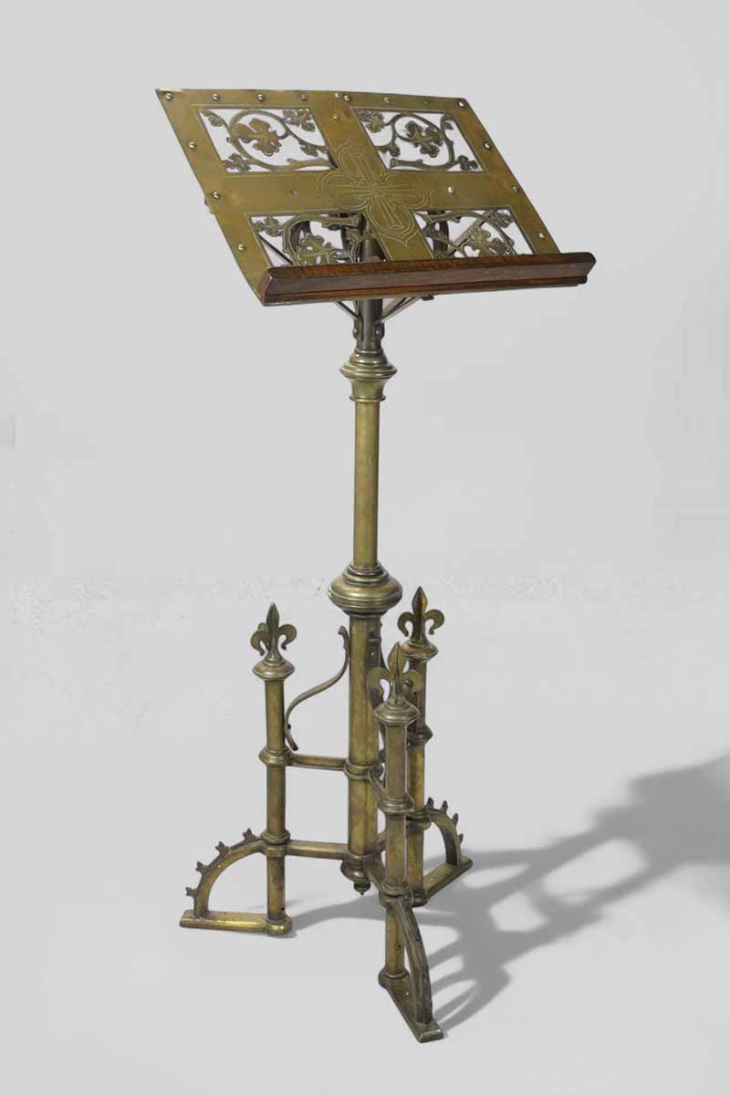 Brass Floor Standing Lectern with Engraved & Cut Out Slope & Wooden Rest on Tripod Legs