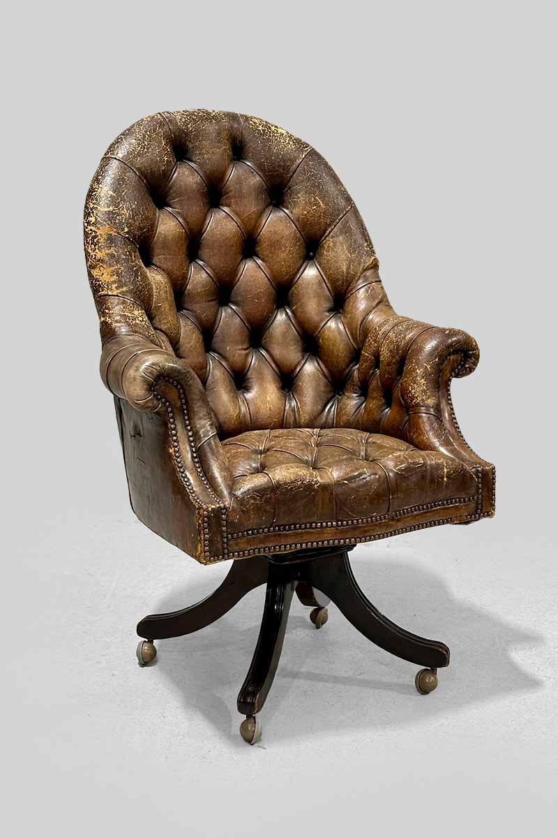 Worn Brown Leather Buttoned Swivel Desk Chair on Castors