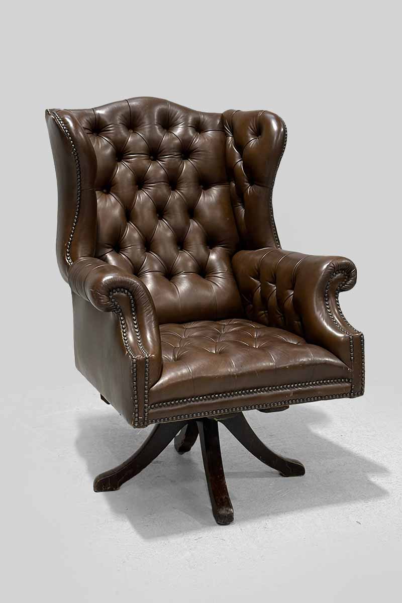 Brown Leather Buttoned Wing Back Swivel Desk Chair