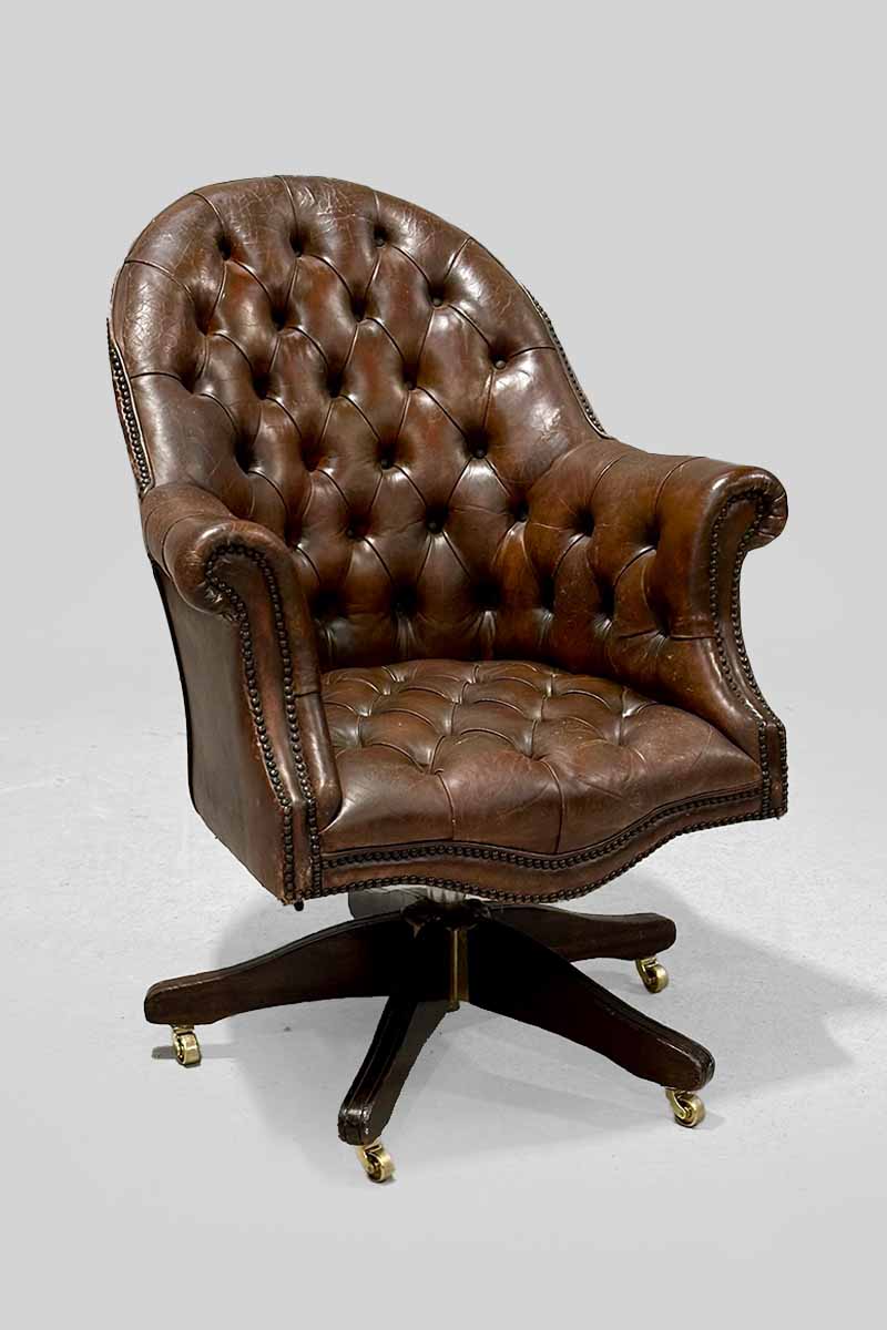 Brown Leather Buttoned Swivel Desk Chair on Castors