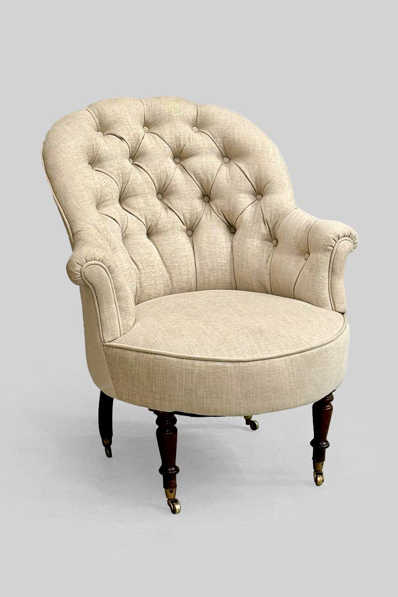 Buttoned Back Armchair with Cream Linen Upholstery on Castors