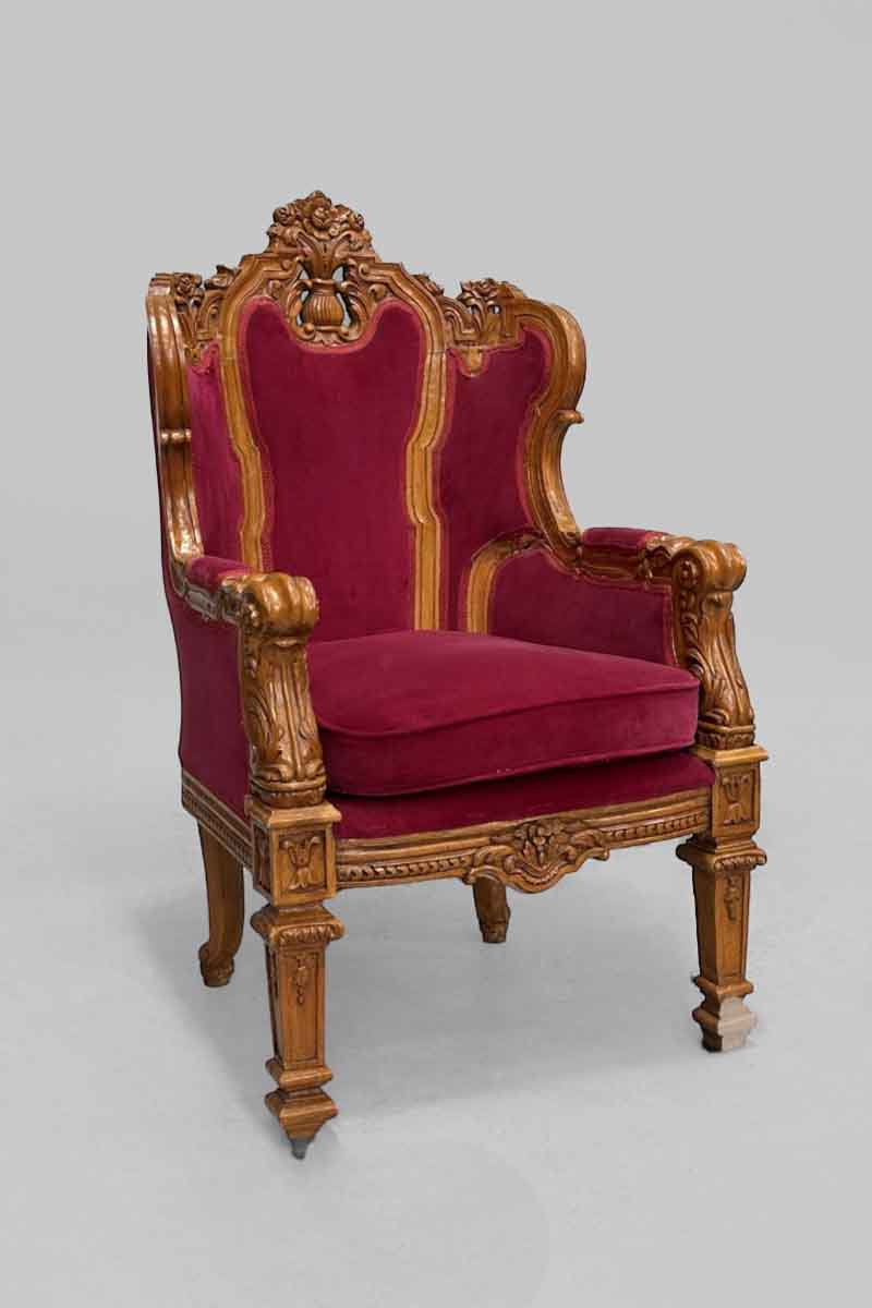 / Carved Mahogany Throne Chair with Maroon Red Velvet Upholstery