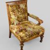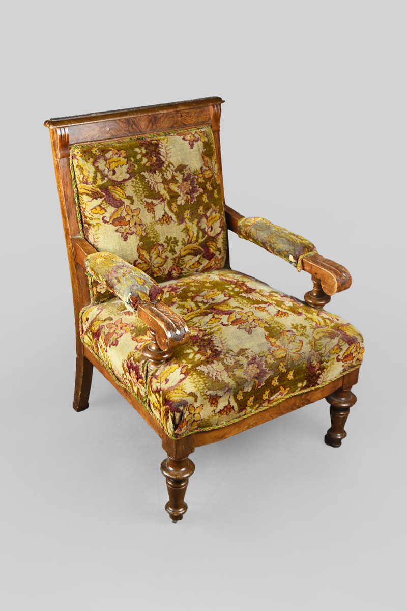 / Walnut Armchair with Green, Cream & Purple Carpet Upholstery