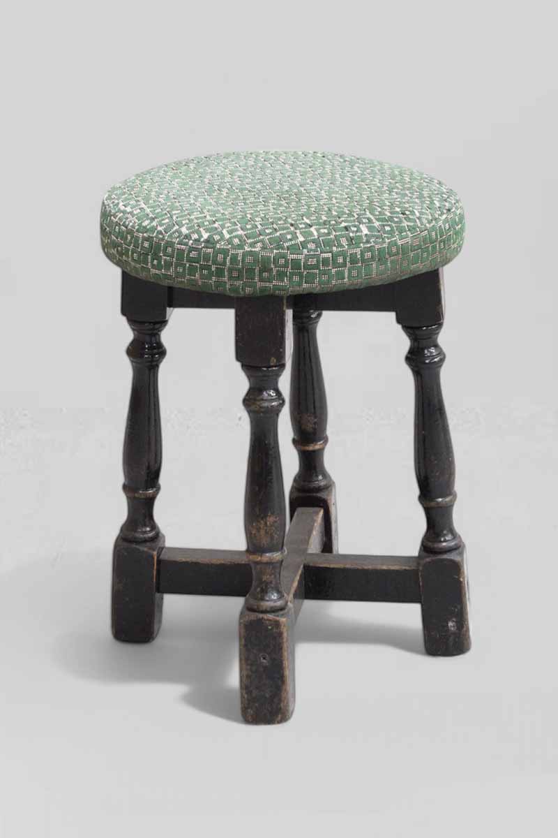 Dark Wood Low Devon Bar Stool with Circular Green Patterned Fabric Seat