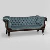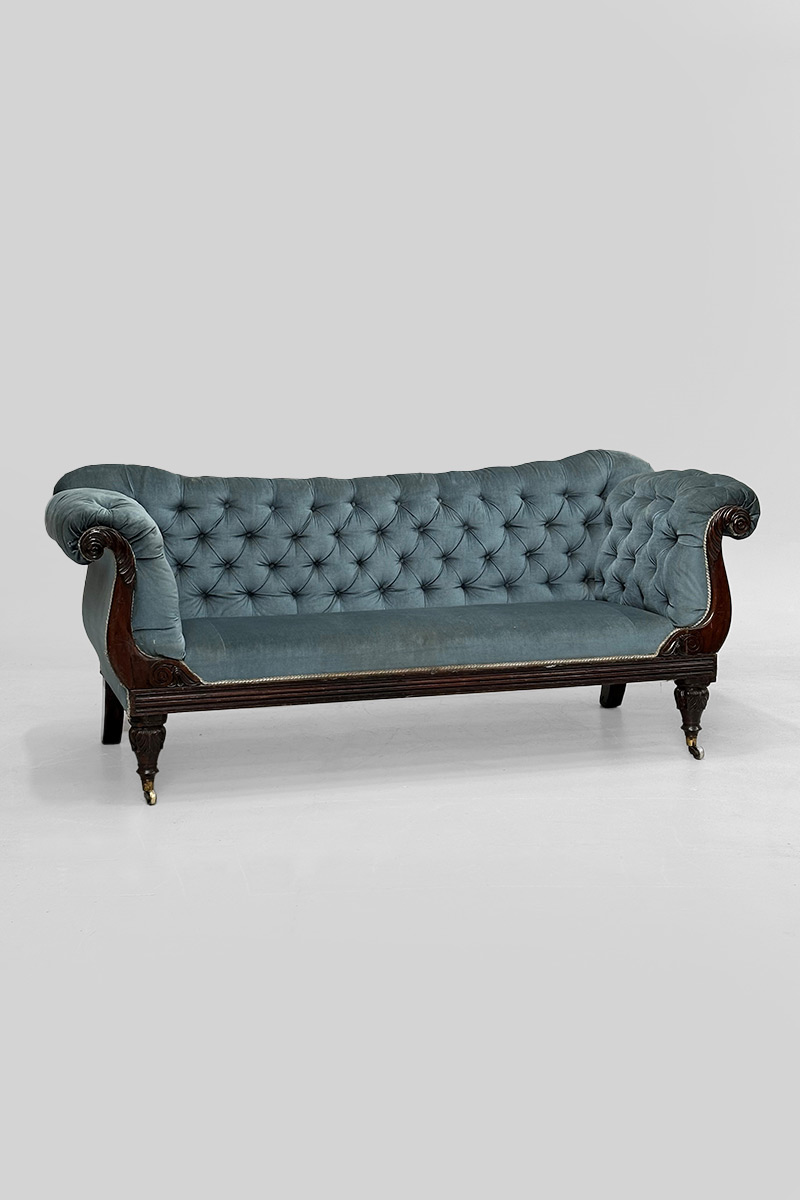 Dark Mahogany 3 Seater Settee with Blue Velvet Upholstery