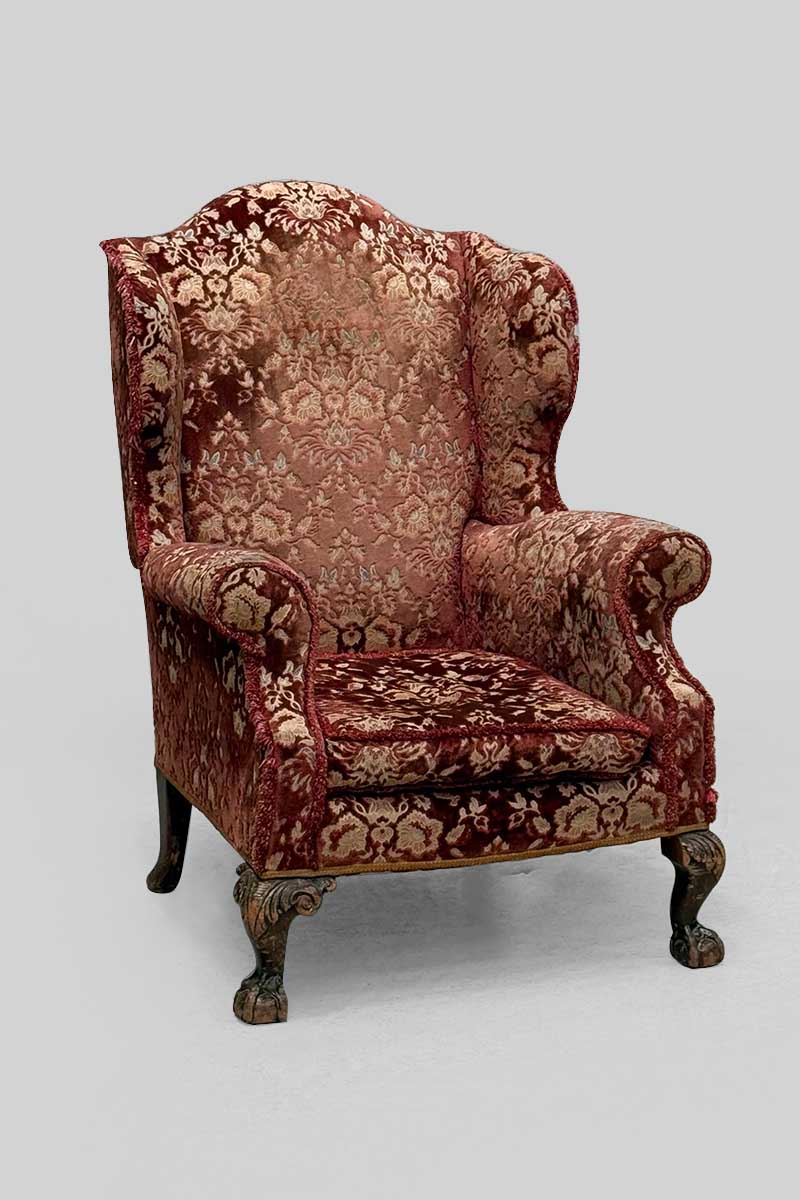 Wing Back Armchair with Maroon & Cream Floral Velvet Upholstery (worn)