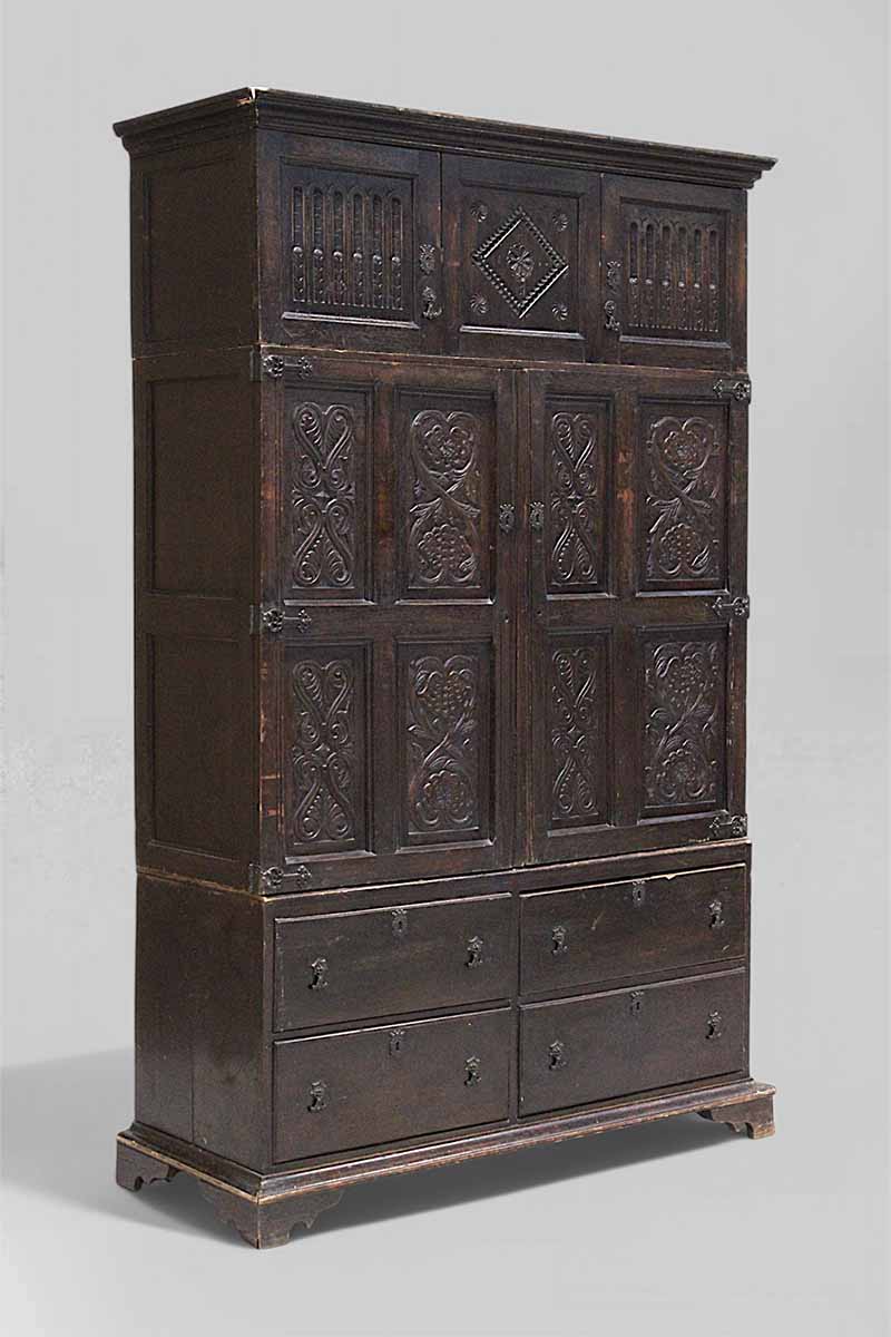 Oak Heavily Carved Cupboard on 4 Drawer Chest