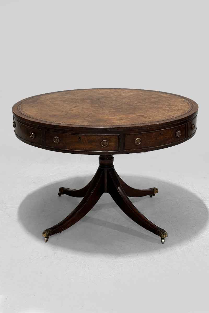 Mahogany Circular Centre / Drum Table with Brown Leather Top