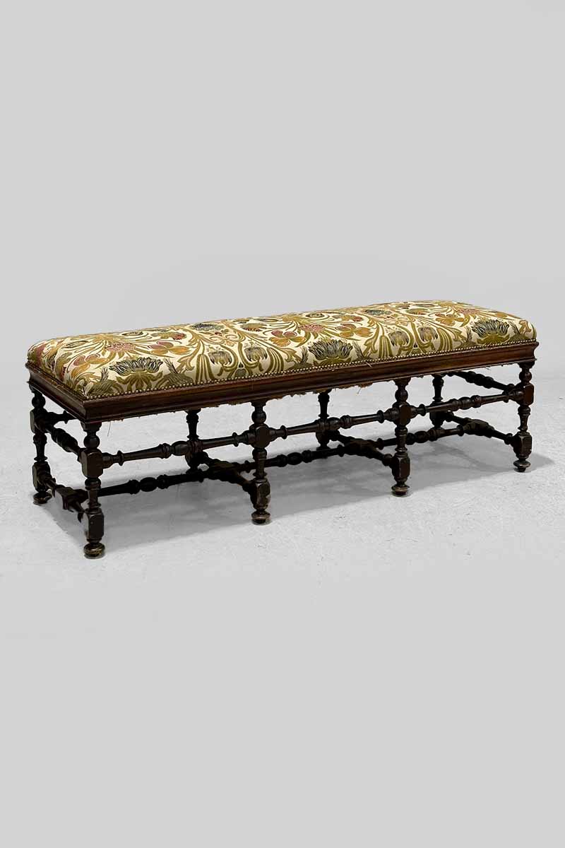 Green & Cream Tapestry Upholstered Oak Bench / Stool with Heavy Turned Legs