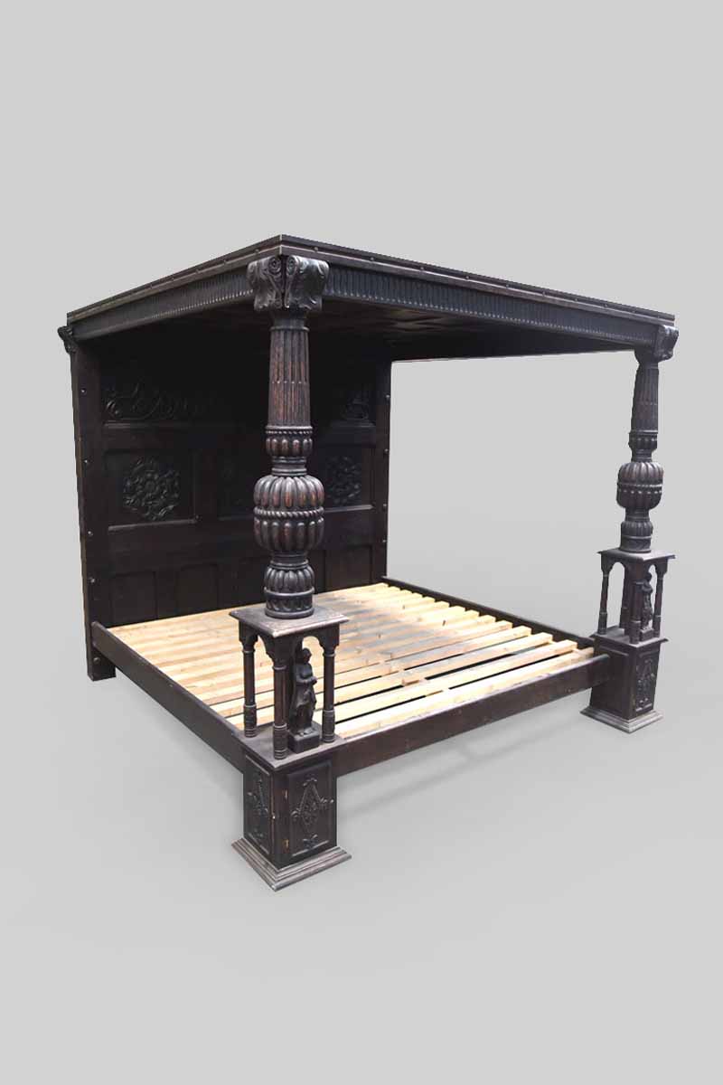 / Huge carved oak 4 poster bed, with panelled tester, ornate melon columns & mattress