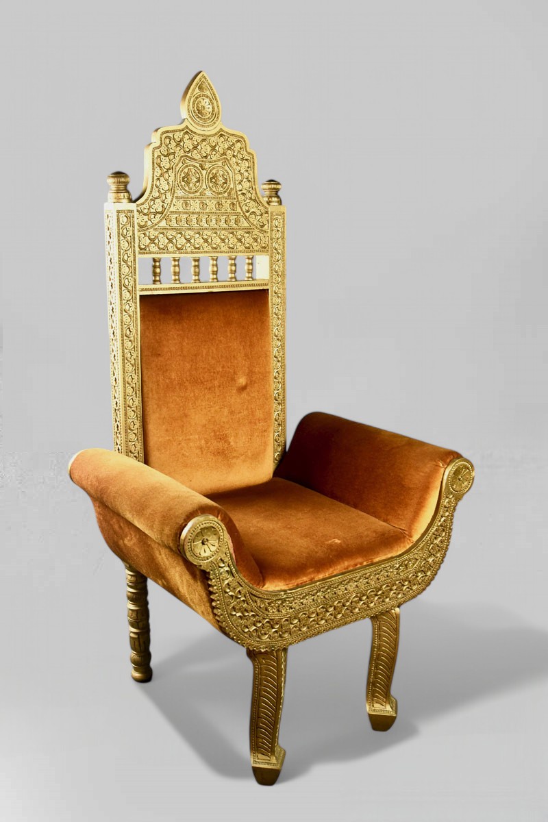 / Indian Gilt & Carved Throne Chair with High Back & Orange Velvet Upholstery