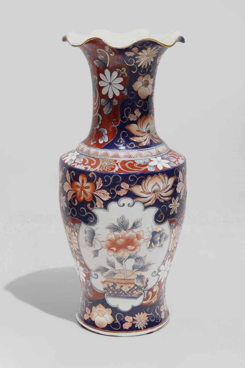 Large Blue Red & Orange Oriental Flowers Vase with, Wavy Top