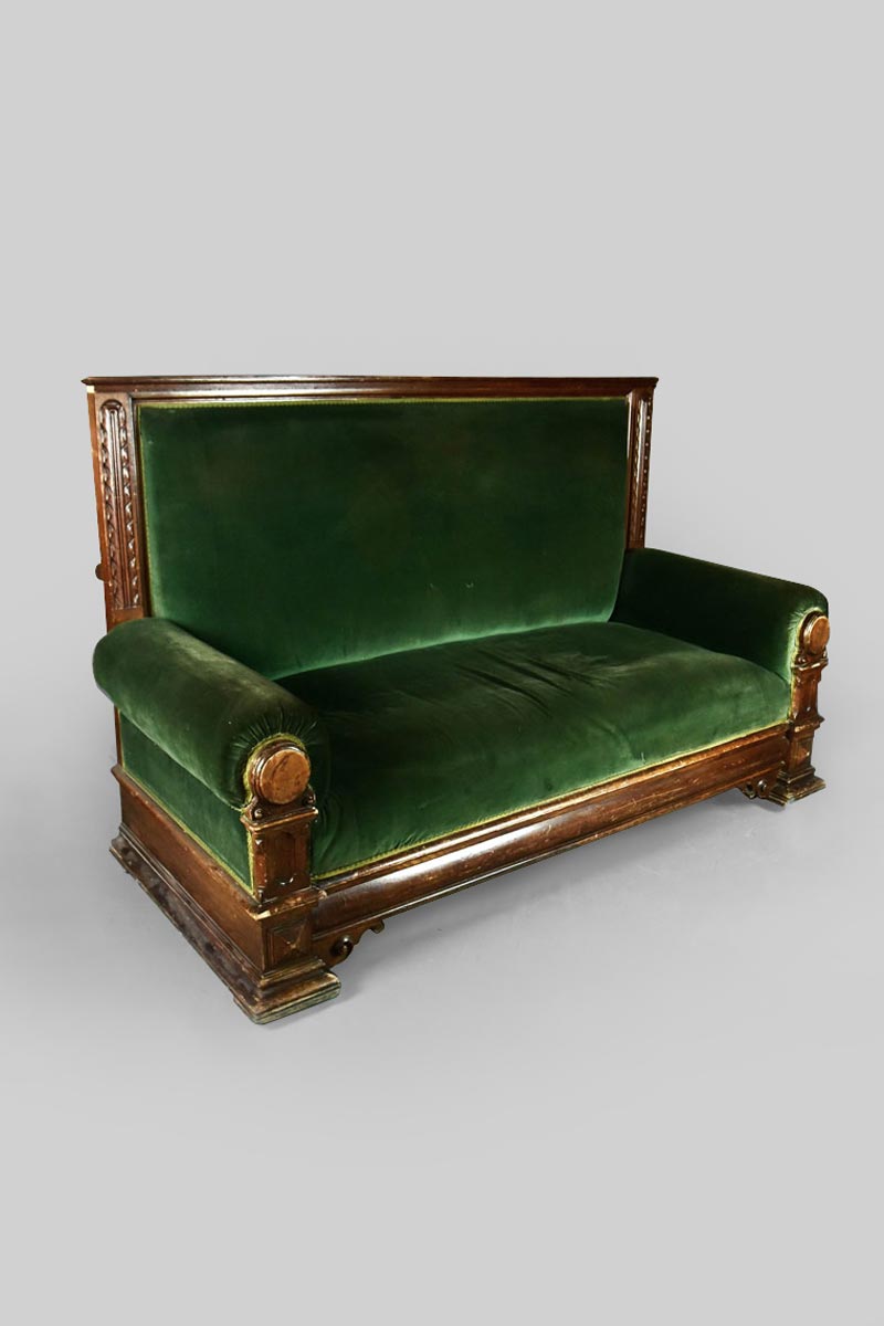 Large Oak Carved High Back Settee with Green Velvet Upholstery