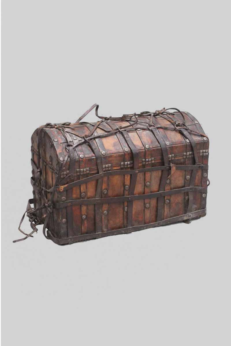 Leather Studded Dome Top Chest / Trunk with Criss-Cross Trim & Loose Strapping