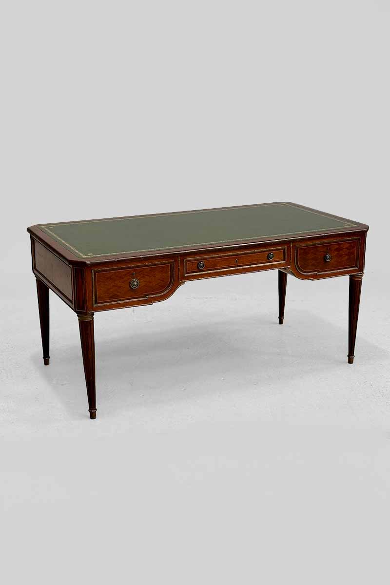 Mahogany & Brass Inlaid Writing Table / Desk with 3 Drawers & Green Leatherette Top