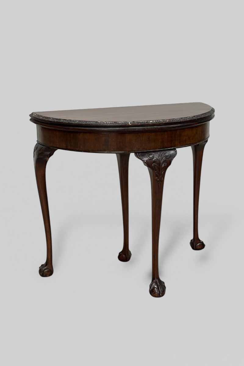 / Mahogany Demi Loon Card Table with Carved Detail & Green Baize Interior