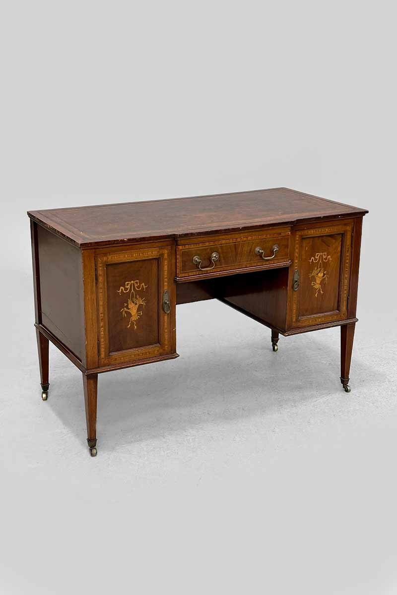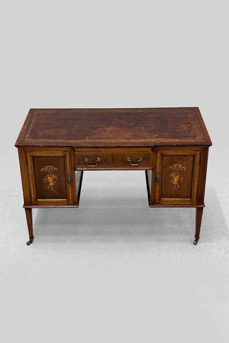 Mahogany Inlaid Kneehole Writing Table / Desk with Brown Leather Top