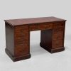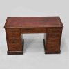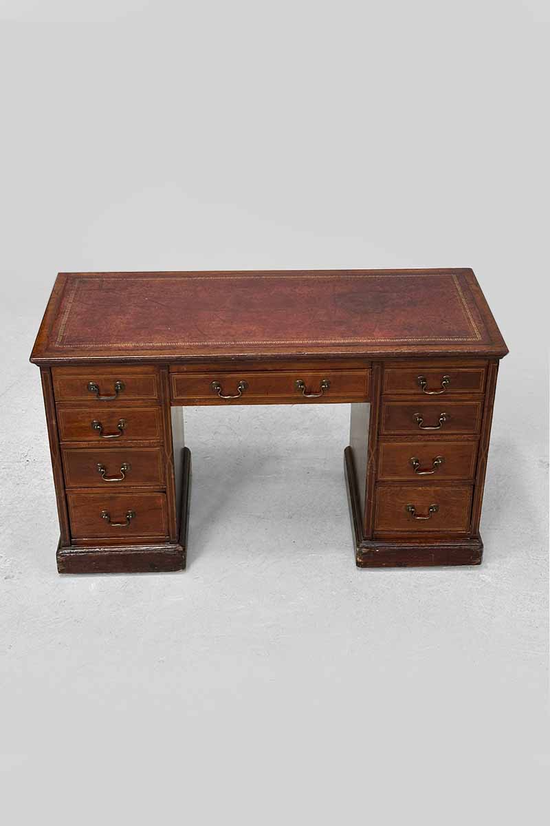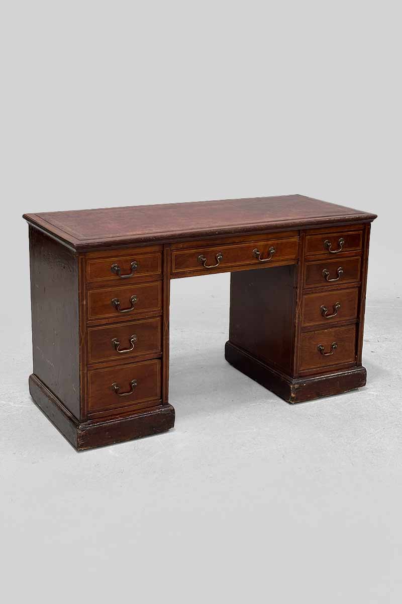 Mahogany Inlaid Small Pedestal Desk with 9 Drawers & Brown Leather Top