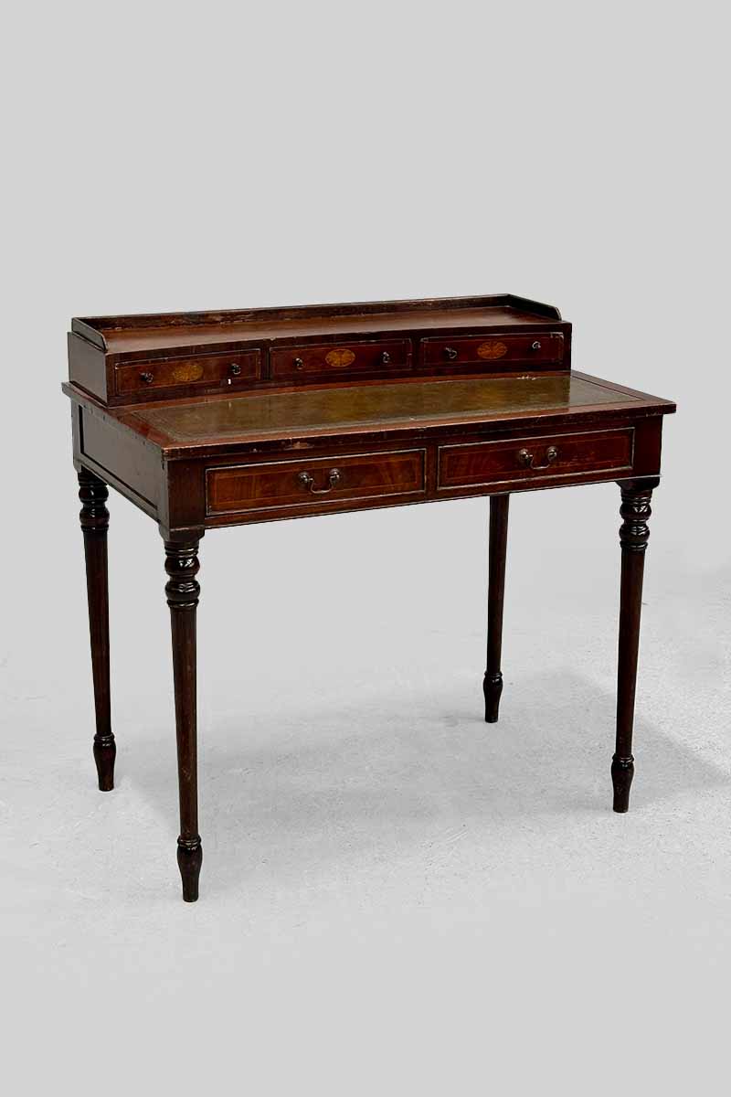 Mahogany & Inlaid Writing Table / Desk with Green Leather Insert & 5 Drawers