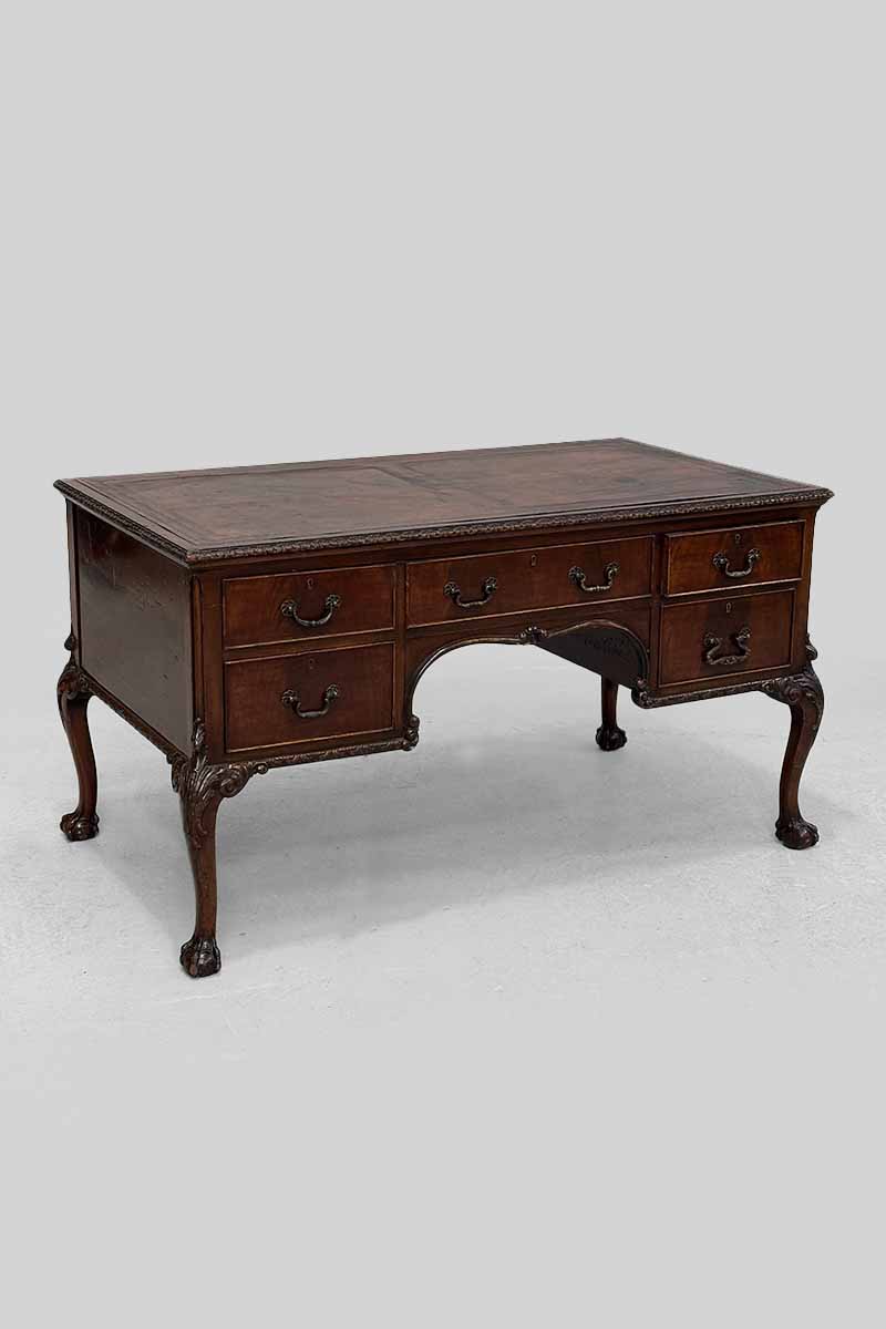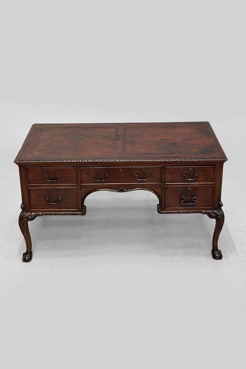 Mahogany Kneehole Writing Table / Desk with 3 Drawers & Brown Leather Top