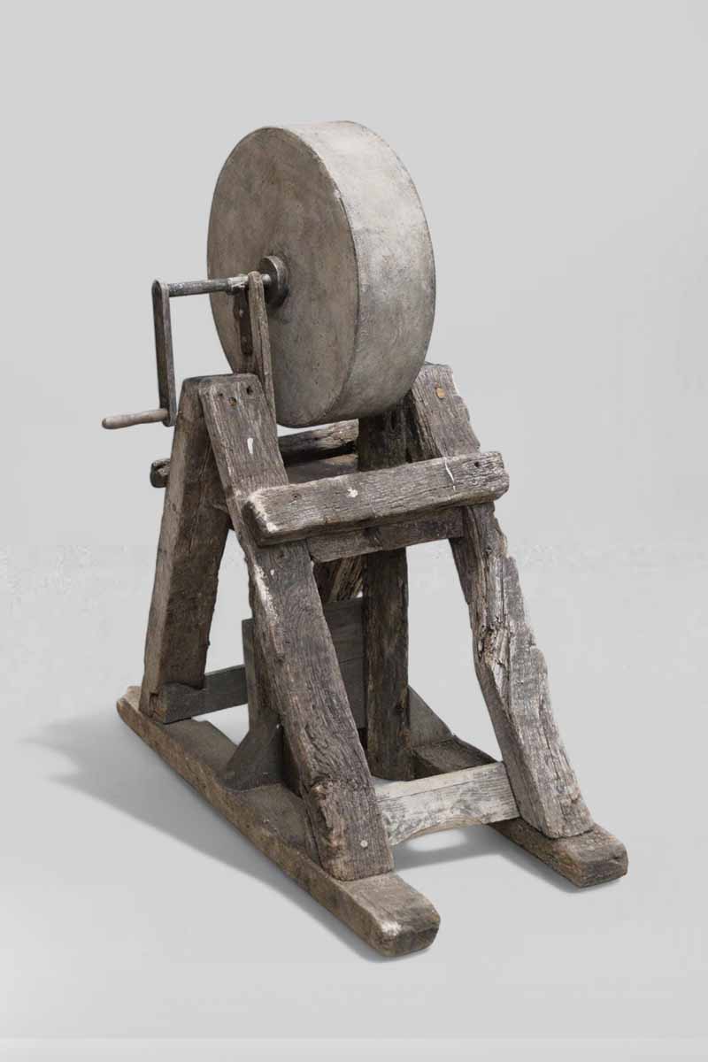 Medium Sharpening / Grinding Stone Wheel on Weathered Rustic Wooden Stand