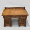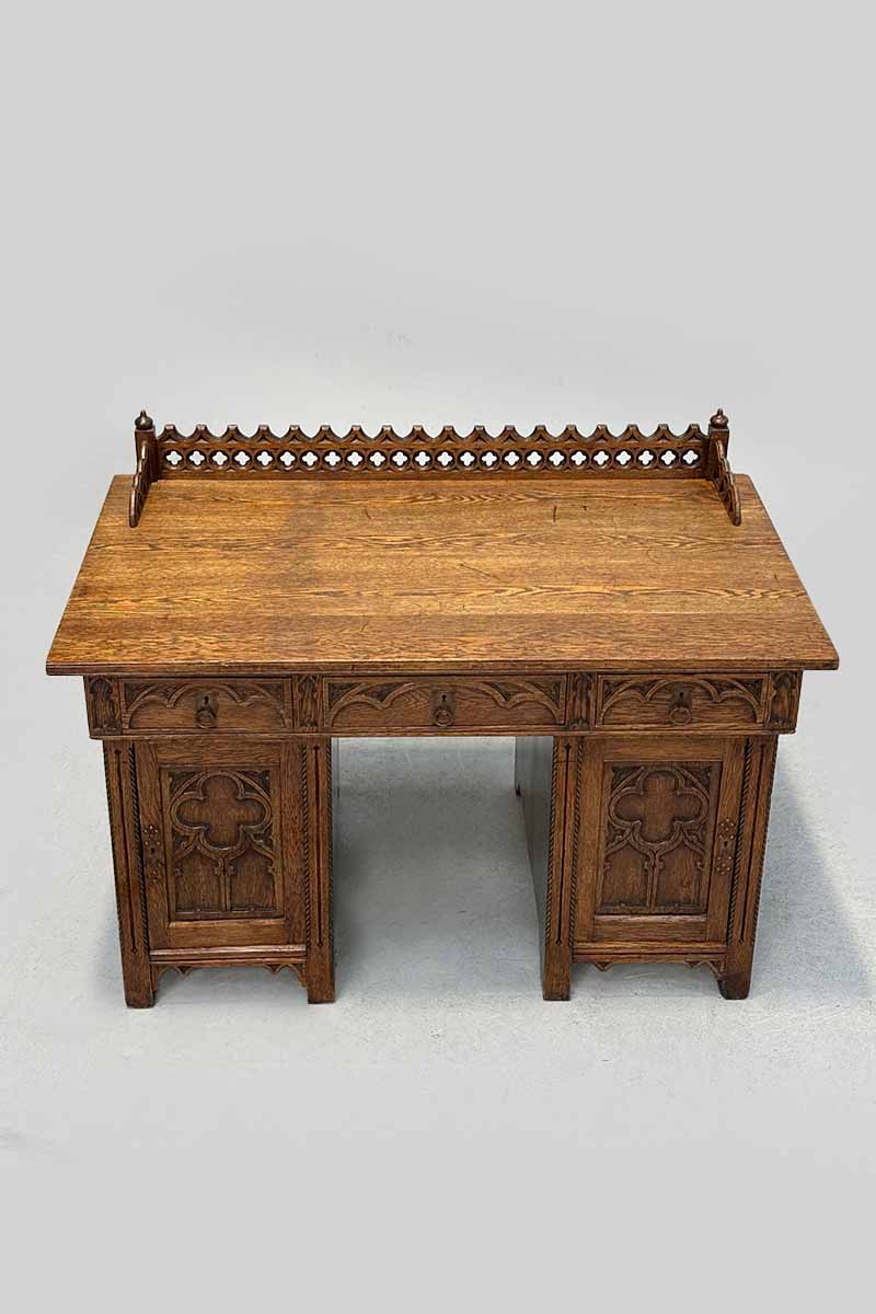 / Oak Arts & Crafts Gothic Pedestal Desk with Carved Gallery Top