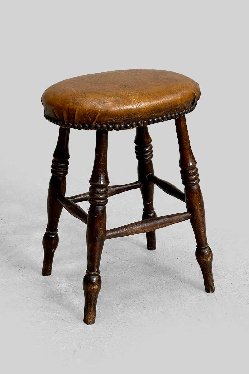 Oak Low Bar Stool with Studded Brown Leather Seat