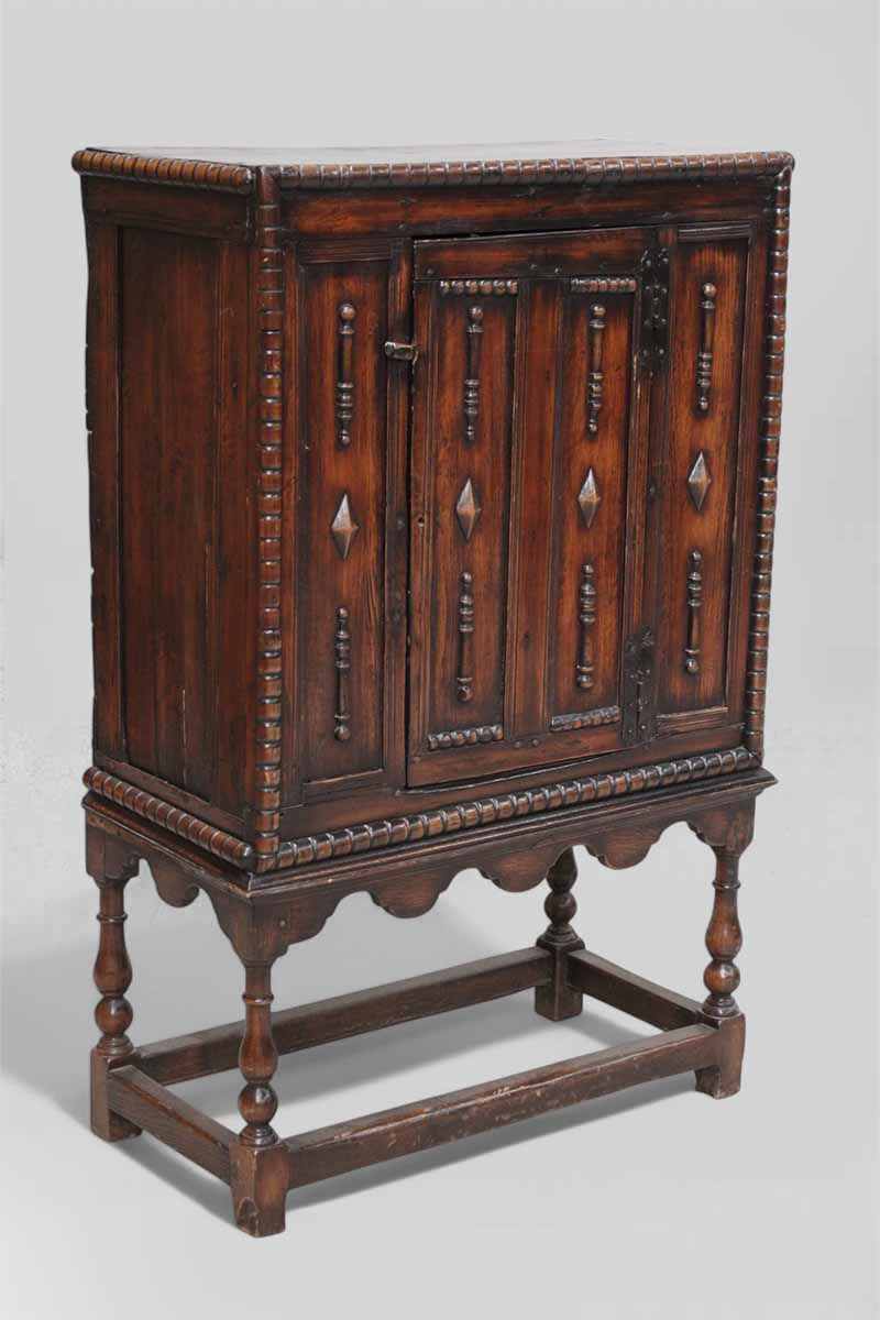 Oak Carved Single Door Cupboard on Turned Leg Stretcher Base