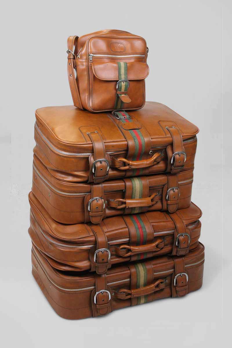 Orange/Tan Leather Luggage with Green & Cream Fabric Buckles