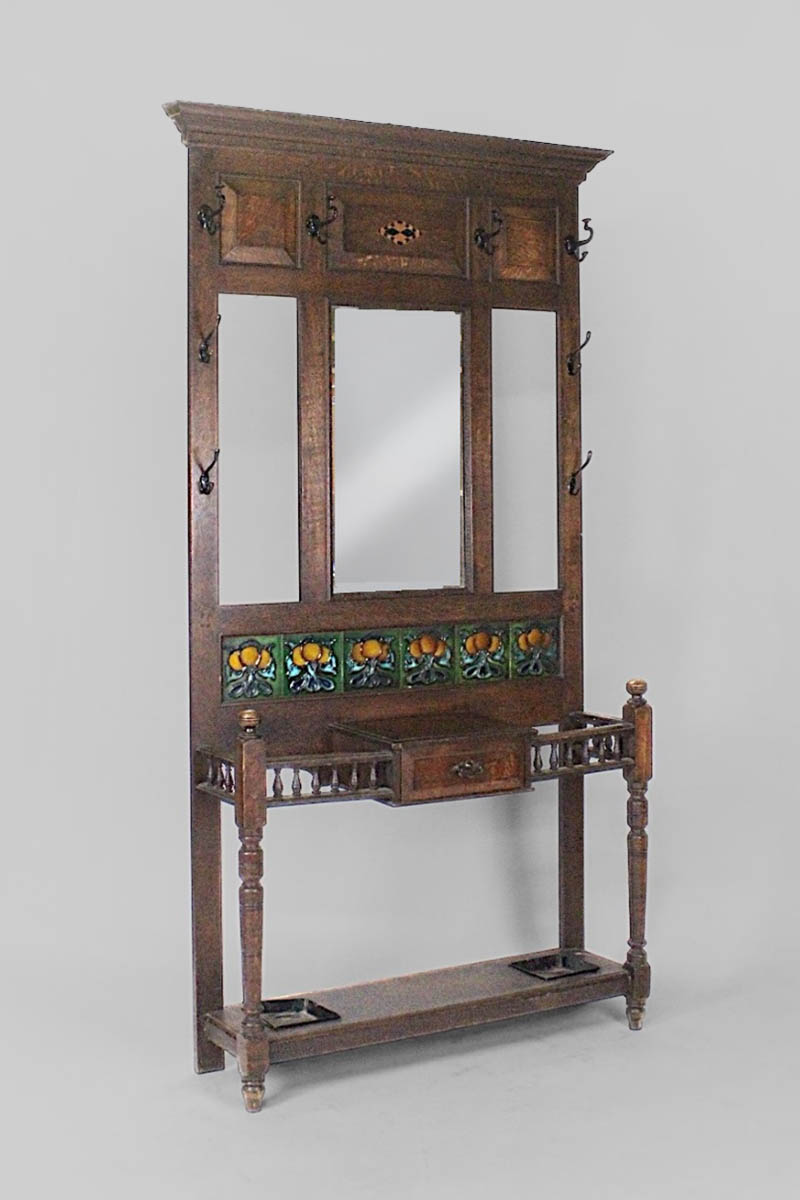 Tall Mahogany Hall Stand with Green, Blue & Yellow Art Nouveau Tiles and Iron Hooks