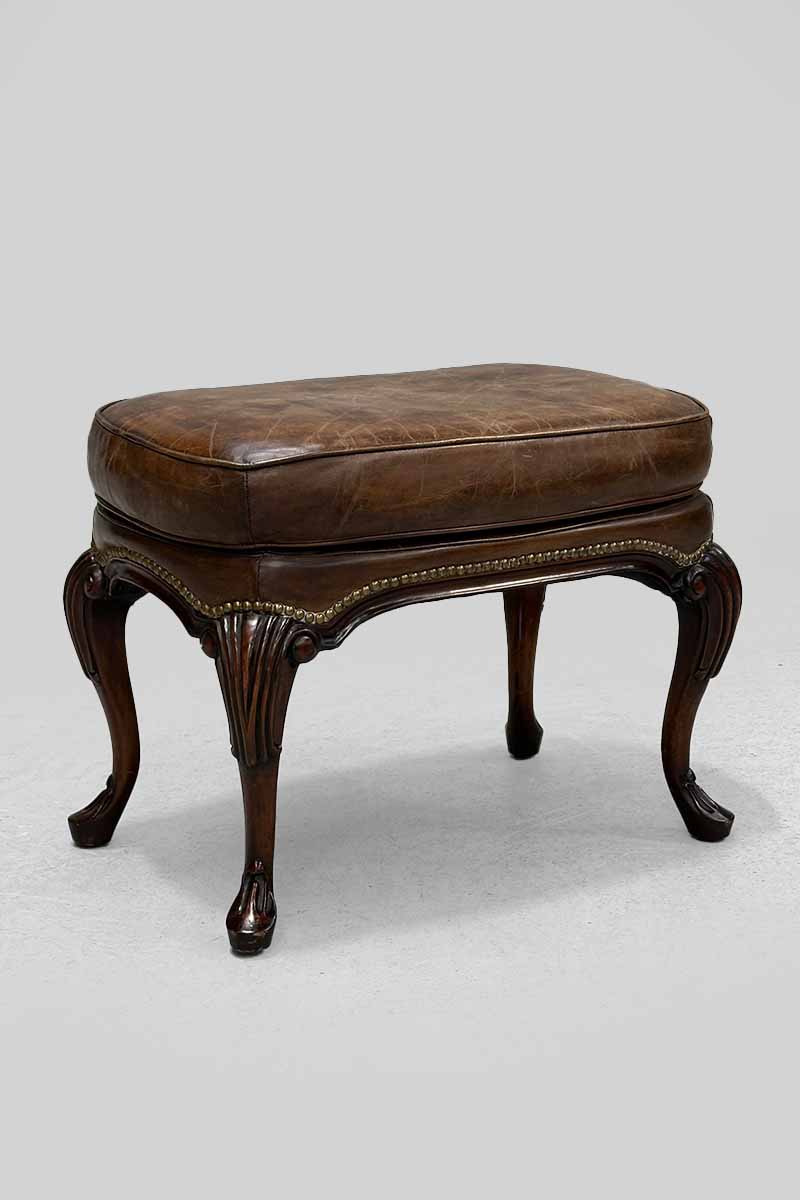 Brown Leather & Studded Oblong Shaped Stool on Carved Cabriole Legs