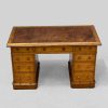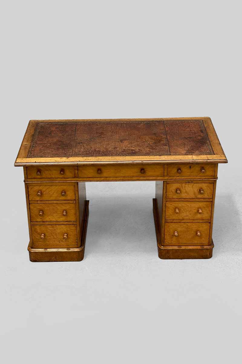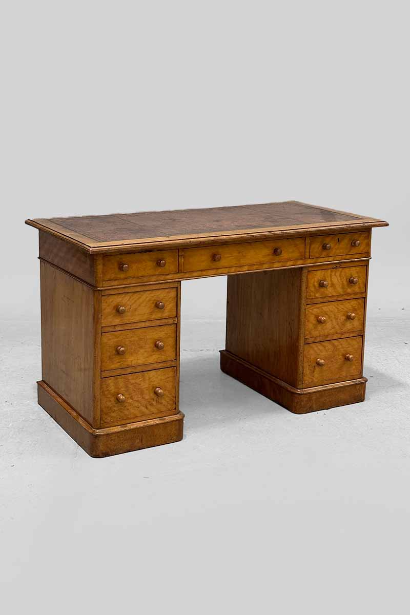 Satinwood Small Pedestal Desk with 9 Drawers & Worn Red Leather Top