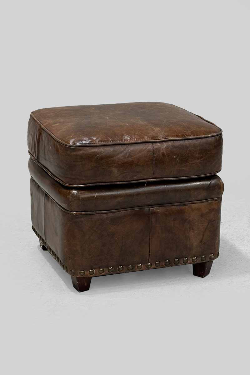 / Square Dark Brown Leather Pouffe on Small Square Feet (worn)