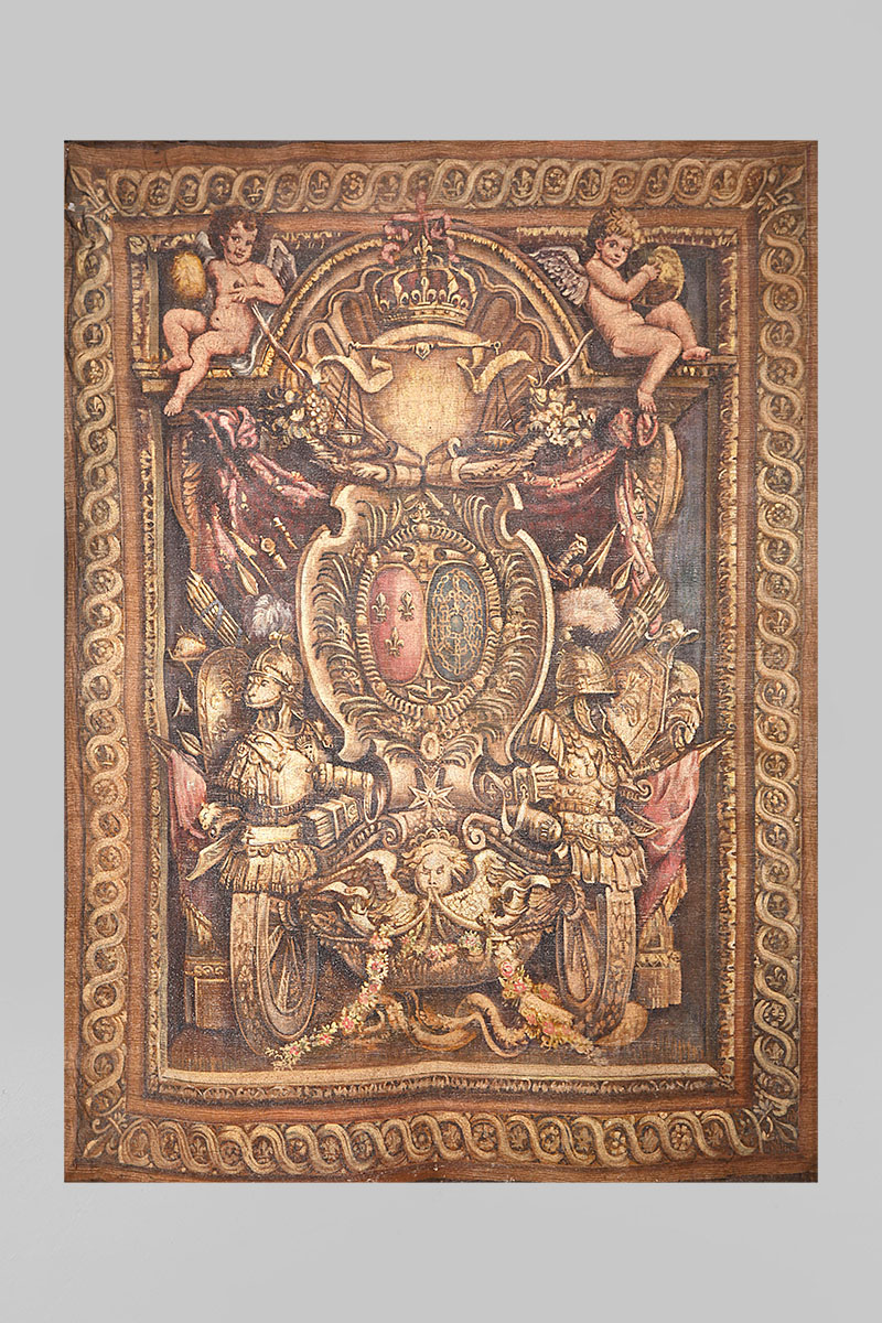 / Tapestry – 2 Cherubs Sitting on Armorial Crest – “Armorial & Putti” 7′ x 9′