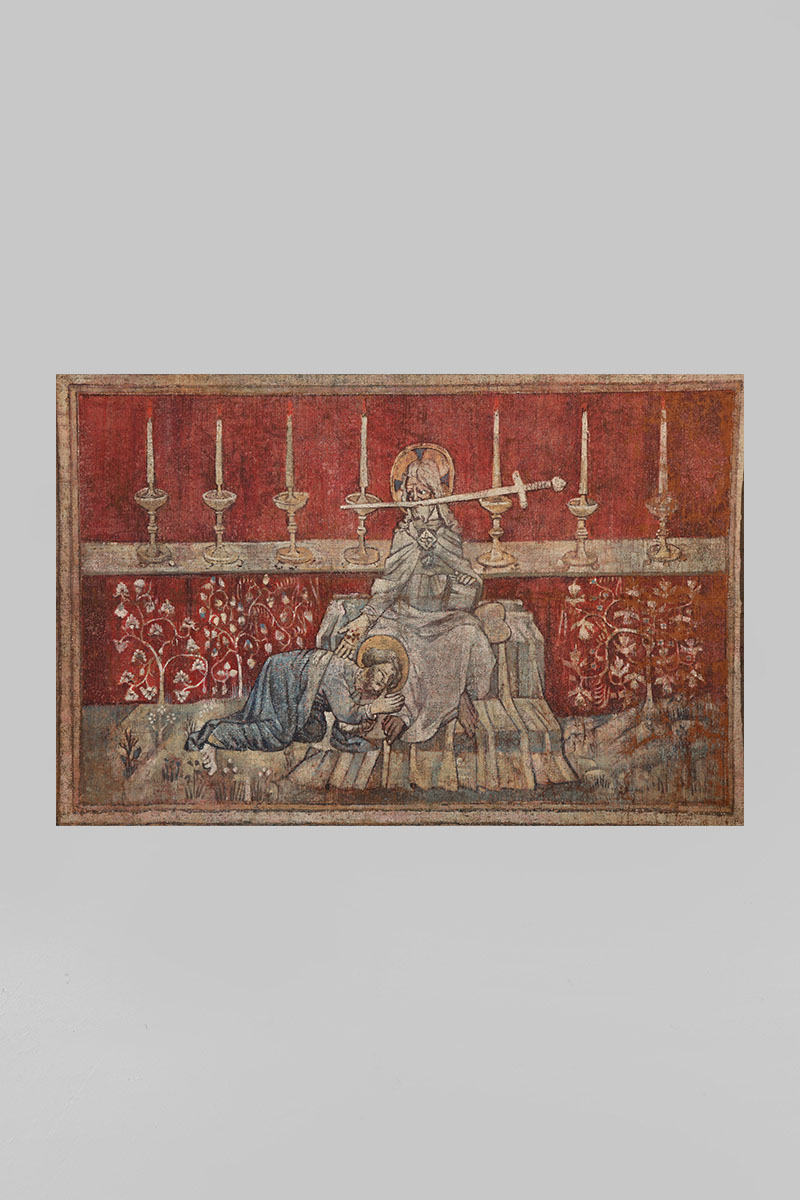 Tapestry – 2 Religious Figures with Sword in Red & Blue 8′ 7″ x 5′ 8″