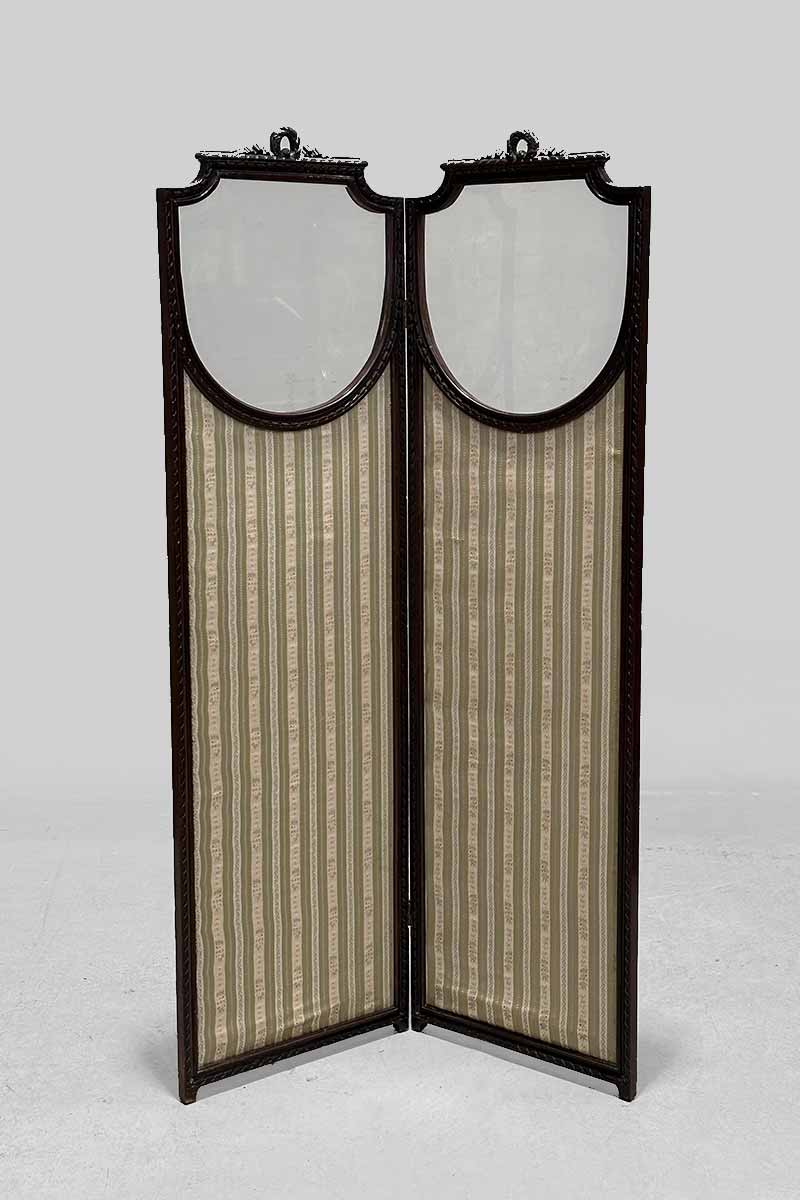 / Two Leaf Screen Mahogany Framed Green Striped Fabric & Glazed