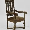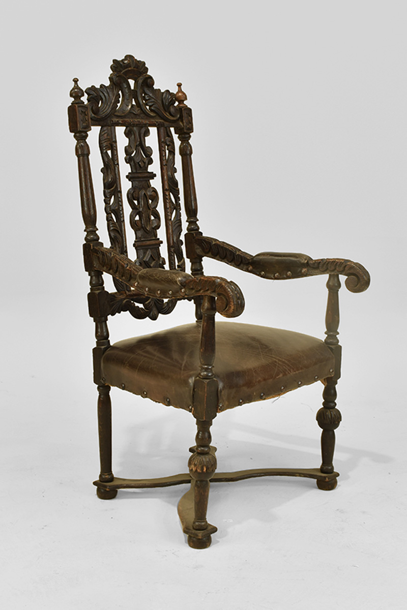 Carved Oak Carver or Elbow Chair with Brown Leather Seat