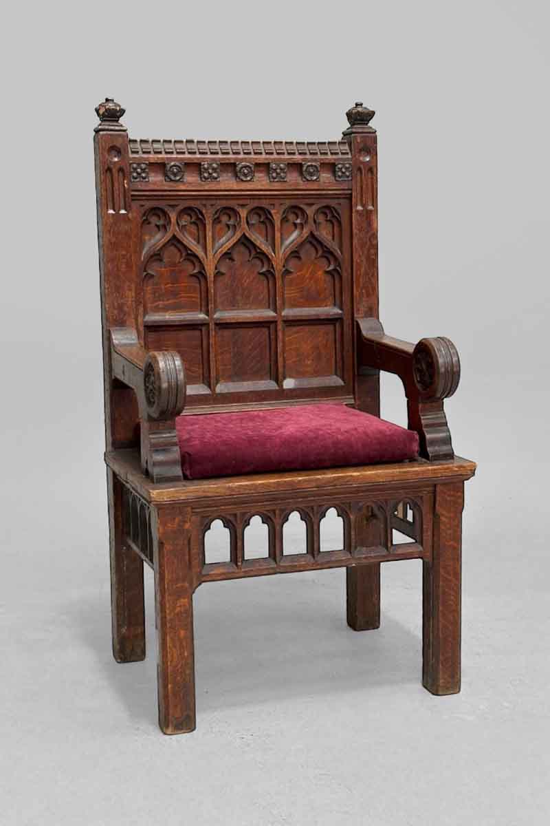 Gothic Oak Carved Throne Chair with Maroon Seat Cushion