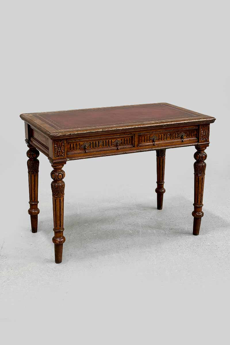 Walnut Carved Writing Table / Desk with 2 Drawers & Worn Red Leather Top