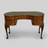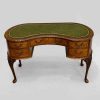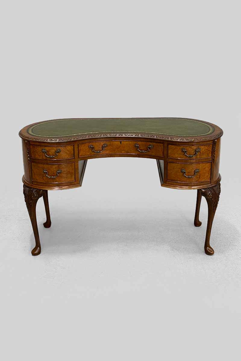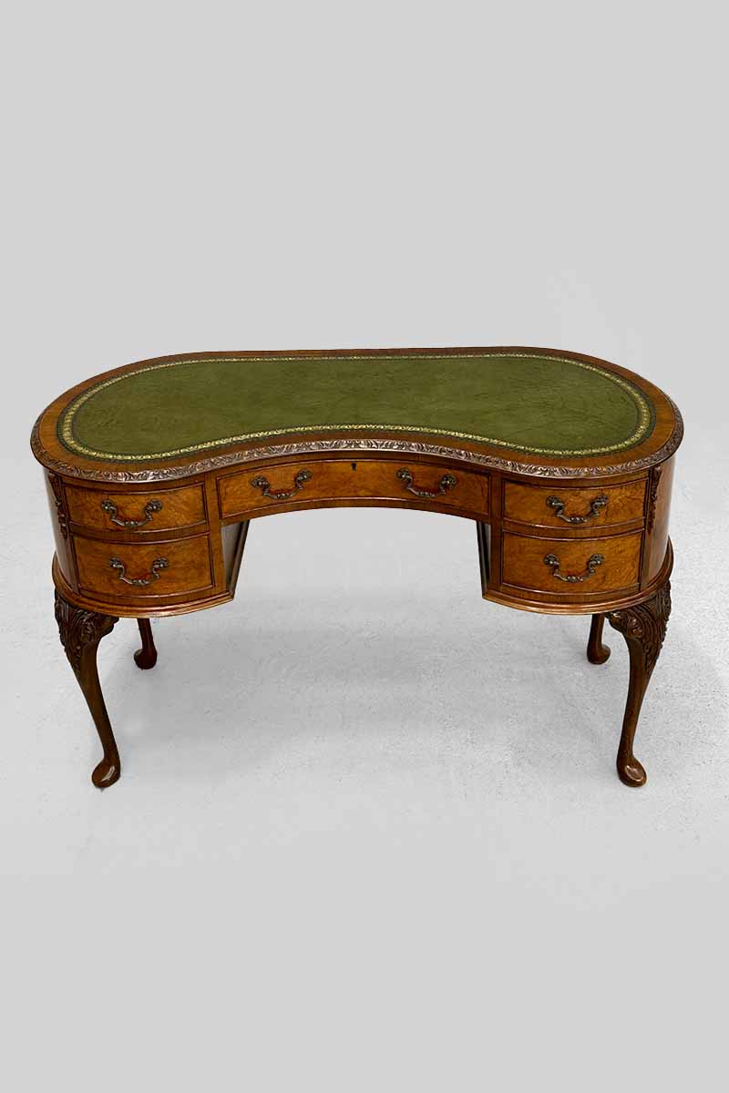 Walnut Kidney Shaped Writing Table / Desk with 5 Drawers & Green Leather Top