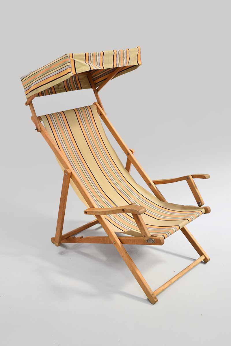 / Wooden Deck Chair / Sun Lounger with Striped Pattern Seat & Canopy Head Protector